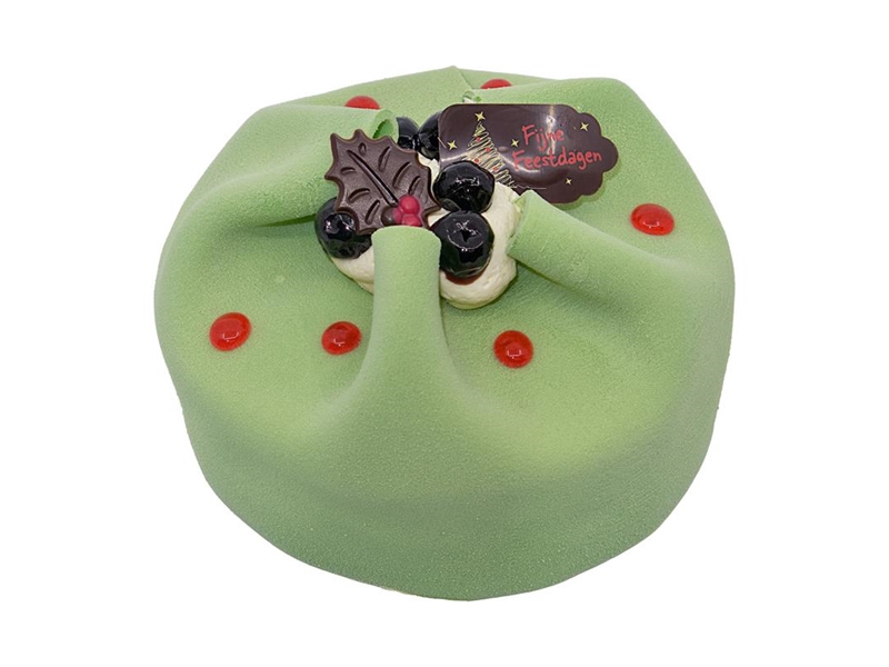 Dit heerlijke kersttaartje dat gevuld is met: moscovisch kapsel, twee laagjes slagroom, perzik blokjes en abrikozenmouse. Is bekleed met marsepein en afgedecoreerd met kerstdecoratie.
