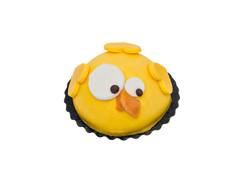Dit leuke gebakje wat in de paassfeer is gemaakt, is gevuld met: moscovisch kapsel, crème, slagroom, abrikozenconfiture en afgewerkt met fondant.